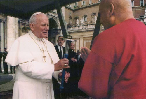 Sri Chinmoy met Pope John Paul II five times between 1980 and 1998. These meetings were recorded in the book Pope John Paul II - God's heart-prize winner. 1